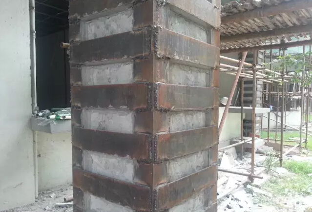 該法是在構(gòu)件外圍包以型鋼的加固方法, 具體可分為濕式外包鋼加固法和干式外包鋼加固法。一般用于混凝土柱、梁、屋架,特別是大型結(jié)構(gòu)和大跨度結(jié)構(gòu)的加固。其中濕法是指型鋼與構(gòu)件通過(guò)乳膠水泥、環(huán)氧樹脂等粘結(jié)劑與原構(gòu)件粘結(jié), 新加型鋼與原構(gòu)件形成整體共同工作; 干法指新加型鋼與原構(gòu)件之間不采用粘結(jié)劑粘結(jié), 不能保證結(jié)合面剪力的有效傳遞。在抗震加固中一般采用濕式外包鋼加固法。適用于加固鋼筋混凝土梁、柱及磚柱、磚煙囪等,但對(duì)于圓形和曲面構(gòu)件加固工藝則相對(duì)復(fù)雜。它具有施工方便,現(xiàn)場(chǎng)工作量少,能有效提高構(gòu)件抗震性能的優(yōu)點(diǎn), 其優(yōu)點(diǎn)是施工方便,現(xiàn)場(chǎng)工作量少,受力可靠。缺點(diǎn)是用鋼量較大,加固維修費(fèi)用較高。當(dāng)采用化學(xué)灌漿外包鋼加固時(shí),型鋼表面溫度不應(yīng)超過(guò)六十度;當(dāng)環(huán)境具有腐蝕性介質(zhì)時(shí),應(yīng)有可靠的防護(hù)措施。